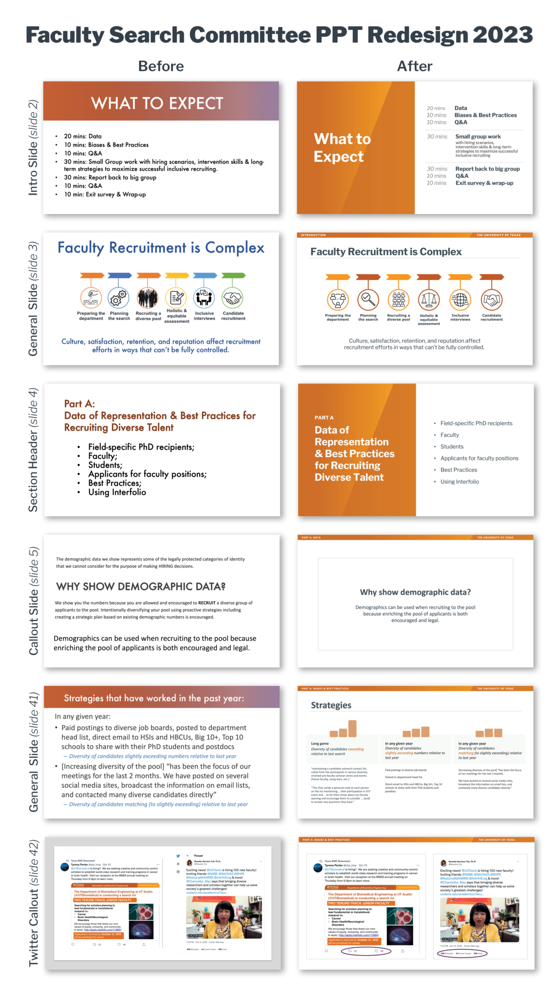 In early 2023 as a Design Student Technology Assistant at the University of Texas Liberal Arts Instructional Technology Services (LAITS) I was one of the main designers on the Faculty Search Committee PowerPoint Redesign. The PowerPoint itself is a 55-slide presentation given to different groups of University of Texas faculty members multiple times per semester. The slides illustrate the statistics behind diversity at the University of Texas and beyond, and work to shine light on the strategies for effectively hiring a diverse workforce.